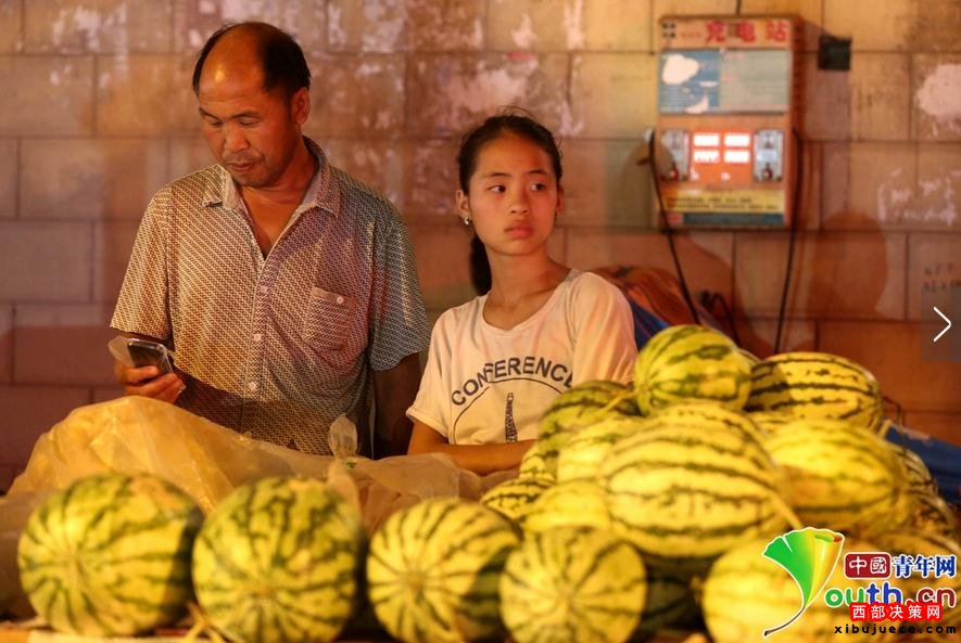 2016年7月10日夜晚,在河南省洛陽(yáng)市老城街頭,宜陽(yáng)縣高村鄉(xiāng)仟佰嶺村47歲的瓜農(nóng)石勛帶著12歲的女兒賣(mài)西瓜。“現(xiàn)在帶女兒賣(mài)瓜讓她體驗(yàn)一下瓜農(nóng)的艱辛是為了長(zhǎng)大女兒不再賣(mài)瓜,我家種了四畝西瓜,從家里到洛陽(yáng)開(kāi)拖拉機(jī)要跑六個(gè)小時(shí),賣(mài)完西瓜回家趕,每天只能休息三個(gè)小時(shí),女兒去最遠(yuǎn)的地方就是洛陽(yáng)城,一車(chē)西瓜賣(mài)完給女兒20塊零花錢(qián),女兒很開(kāi)心”。石勛說(shuō)。