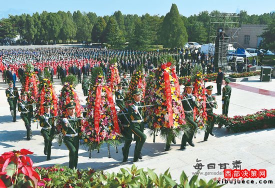 深情的《獻(xiàn)花曲》緩緩奏響,18名禮兵托起省委、省人大常委會(huì)、省政府、省政協(xié)、駐甘人民解放軍和武警部隊(duì)、民主黨派、蘭州市委、蘭州市人民政府、蘭州社會(huì)各界群眾敬獻(xiàn)的9個(gè)花籃,緩步走向烈士紀(jì)念碑。