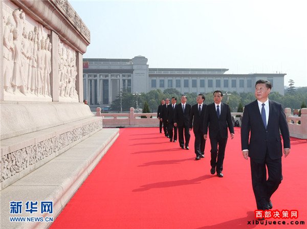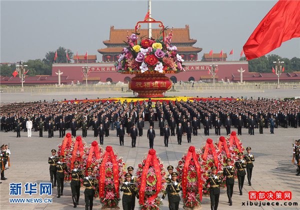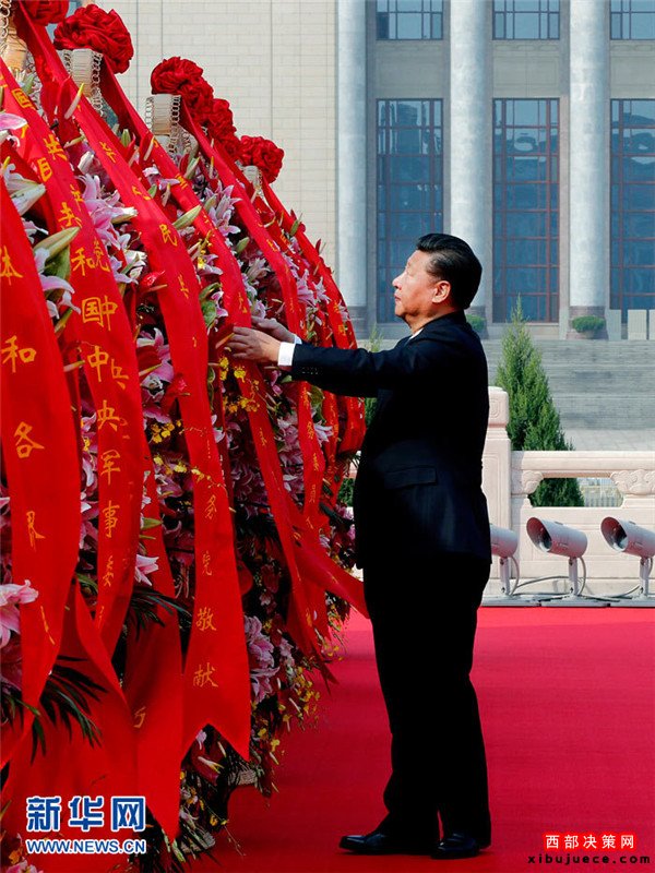 9月30日上午,黨和國家領(lǐng)導(dǎo)人習(xí)近平、李克強、張德江、俞正聲、劉云山、王岐山、張高麗等來到北京天安門廣場,出席烈士紀(jì)念日向人民英雄敬獻(xiàn)花籃儀式。這是習(xí)近平整理花籃上的緞帶。新華社記者鞠鵬攝