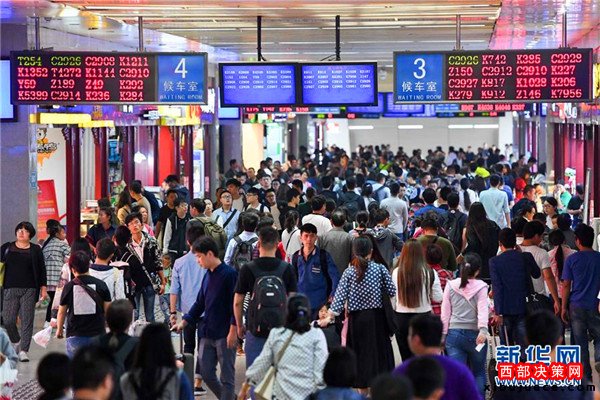 10月7日,乘客在鄭州火車(chē)站內(nèi)準(zhǔn)備進(jìn)站乘車(chē)。