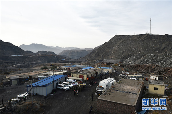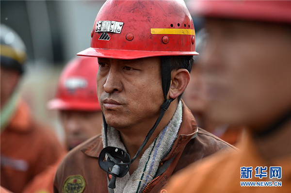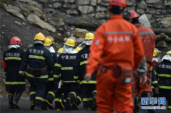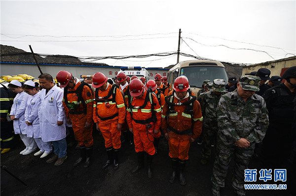 10月11日,在寧夏石嘴山市林利煤礦,現(xiàn)場搜救工作暫停后救援人員進(jìn)行集體默哀。