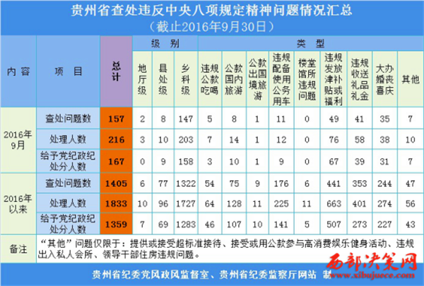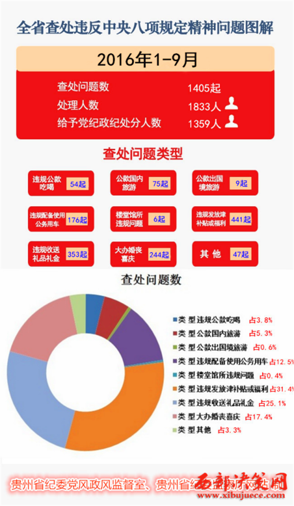 2016年1至9月,貴州省共查處違反中央八項規(guī)定精神問題1405起,處理1833人,給予黨紀(jì)政紀(jì)處分1359人。