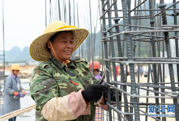 工人在廣西都安瑤族自治縣八仙易地扶貧搬遷安置新區(qū)工地施工中。