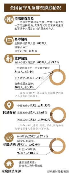 在昨日召開的農(nóng)村留守兒童關(guān)愛(ài)保護(hù)工作部際聯(lián)席會(huì)議上,民政部副部長(zhǎng)高曉兵透露了此次摸底排查的結(jié)果。據(jù)她介紹,此次摸底排查開始于今年3月底,排查結(jié)果顯示,全國(guó)農(nóng)村留守兒童902萬(wàn)人。