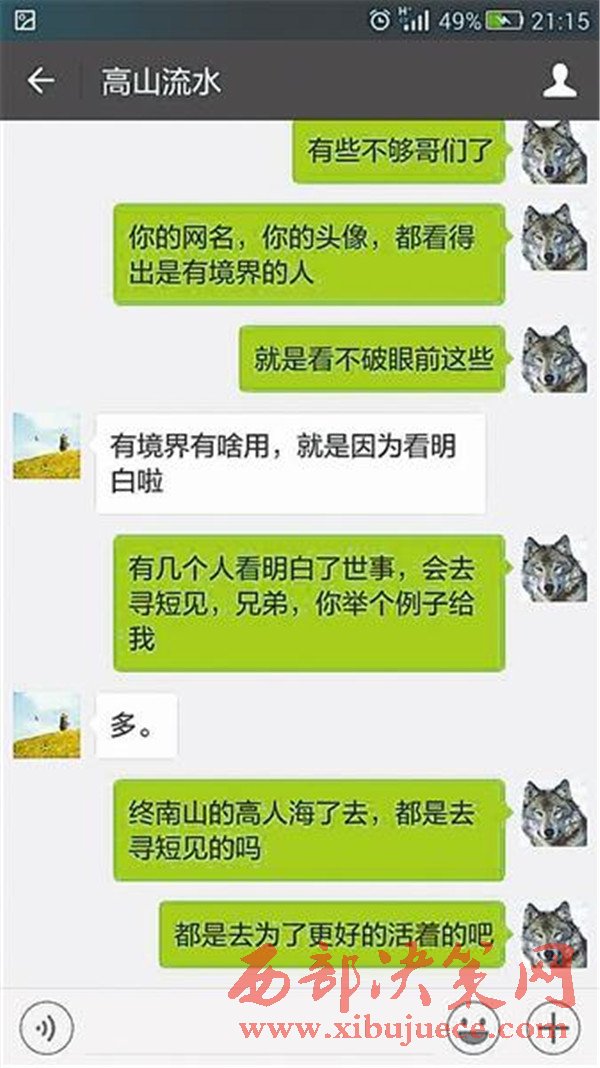 40歲的王先生居住在陜西,他與徐超原本并不相識(shí)。幾天前,王先生在貼吧發(fā)出一條交友的帖子,而后與網(wǎng)名為“他的眼淚在流淌”的徐超成為了微信好友。交流不久后,徐超突然表現(xiàn)出了輕生的念頭。在交流中,徐超接連表示“受苦太多想死”、“跳樓算了”……徐超說(shuō),自己“命不好”,事業(yè)和愛(ài)情都沒(méi)有,已經(jīng)“堅(jiān)持不了了”。