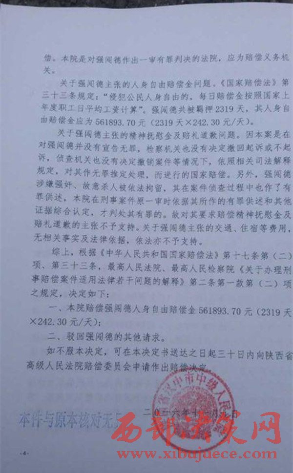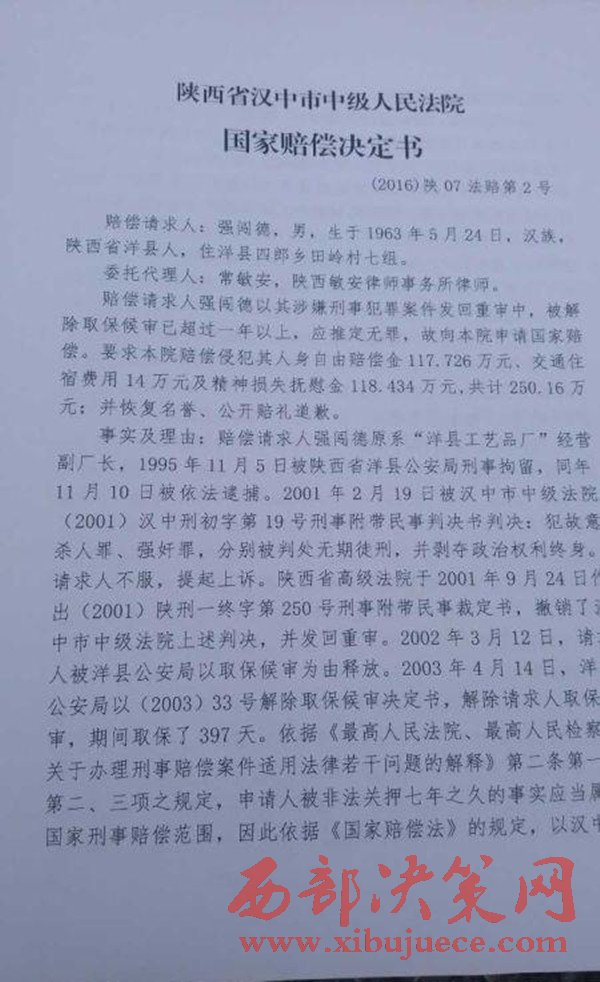 2016年11月9日,陜西省漢中市中級(jí)人民法院作出國家賠償決定,國家賠償書上說,根據(jù)《中華人民共和國國家賠償法》的有關(guān)規(guī)定,決定賠償強(qiáng)闖德561893.70元。(強(qiáng)闖德共被羈押2319天,每天按242.30元賠償)。而對(duì)于強(qiáng)闖德提出的交通、住宿等費(fèi)用,以及精神賠償?shù)纫?,不予支持?/span>