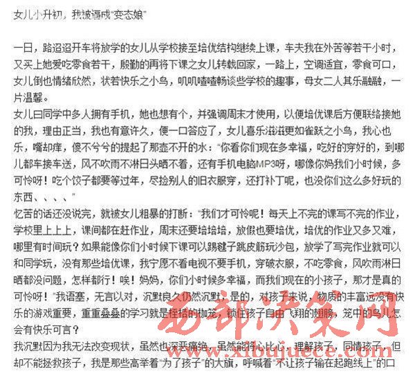 家長如此不辭辛勞,背后卻也有著道不盡的苦水。武漢一位媽媽就發(fā)出了名為《女兒小升初,我被逼成"變態(tài)娘"》的帖子,講訴自己節(jié)衣縮食,卻給孩子花很多錢報各種培訓班,控訴"變態(tài)的培優(yōu)市場"和不公平的升學門檻,引來許多家長共鳴。