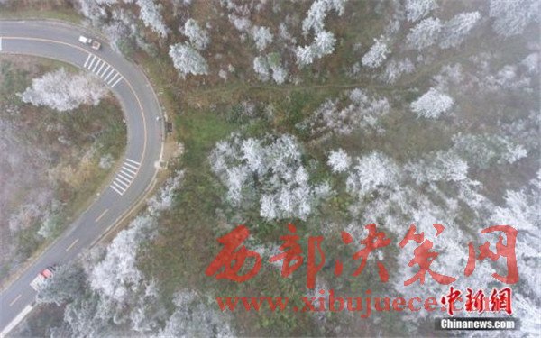 11月24日,航拍雷公山霧凇景觀。據(jù)貴州省氣象臺預報,受強冷空氣影響,貴州省大部地區(qū)降溫幅度都在8到16℃之間,部分地區(qū)出現(xiàn)雨夾雪。位于貴州省雷山縣的雷公山國家森林公園出現(xiàn)霧凇景觀,美不勝收。