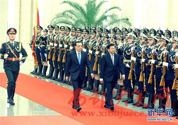11月28日,國務(wù)院總理李克強(qiáng)在北京人民大會堂同來華進(jìn)行正式訪問的老撾總理通倫舉行會談。這是會談前,李克強(qiáng)在人民大會堂北大廳為通倫舉行歡迎儀式。