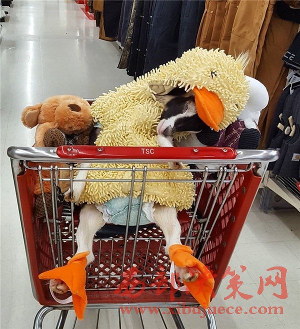 有時(shí)候琳恩出門(mén)又不能把Polly一個(gè)羊扔在家里的時(shí)候,就會(huì)給小家伙套上鴨子服,帶它出去。被打扮成鴨子的小羊在陌生的環(huán)境里也不再害怕,還在購(gòu)物車(chē)?yán)锎蛄藗€(gè)小盹。