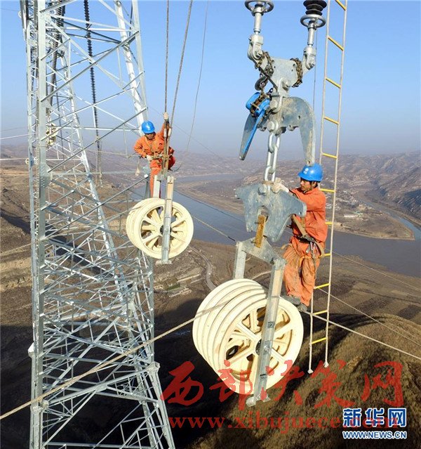 11月30日,施工人員在投放作業(yè)軟梯。當(dāng)日,正在施工的“陜電外送”特高壓工程——1000千伏榆(林)橫(山)至濰坊特高壓交流工程,在陜西省清澗縣與山西省石樓縣之間成功跨越黃河。作為落實國家大氣污染防治行動計劃重點建設(shè)的12條輸電通道之一,1000千伏榆(林)橫(山)至濰坊特高壓交流工程是首個“陜電外送”的特高壓大通道,實施后將帶動陜北煤炭高效清潔利用,減輕煤炭運輸壓力,助力陜西能源產(chǎn)業(yè)轉(zhuǎn)型升級,并有效緩解京津冀魯?shù)貐^(qū)電力供應(yīng)緊張和大氣污染。