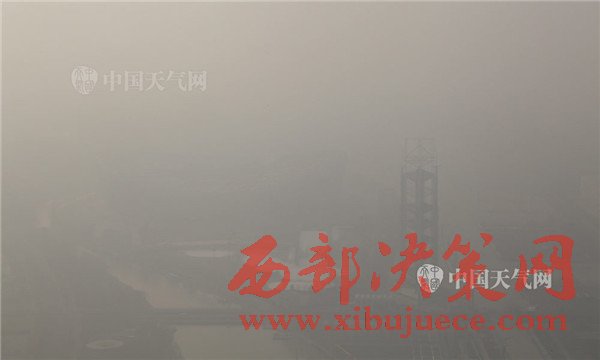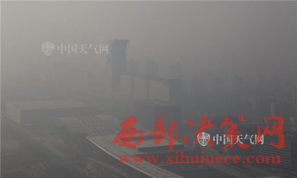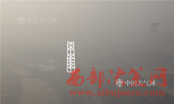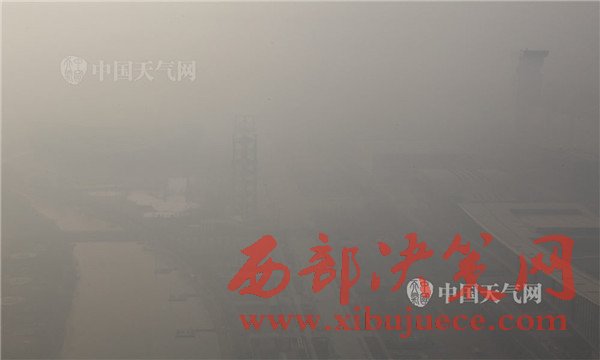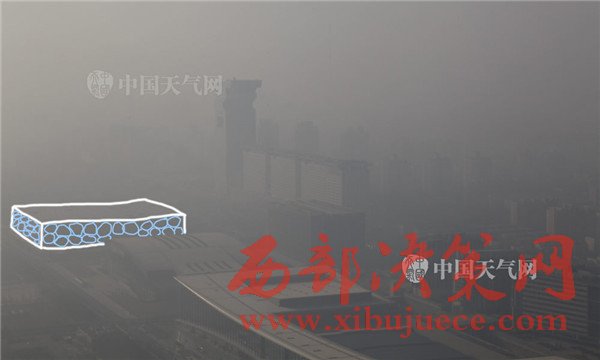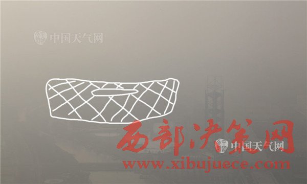 2016年12月19日早晨,北京持續(xù)空氣重污染。記者登上246.8米高的北京奧林匹克塔,鳥瞰北京城,發(fā)現(xiàn)咫尺之遙的鳥巢、水立方等奧運(yùn)場(chǎng)館和城市地標(biāo)建筑被霾“吞沒”,消失不見。圖為鳥巢。