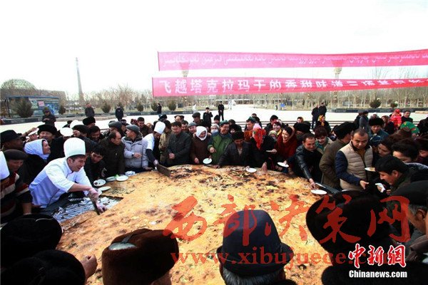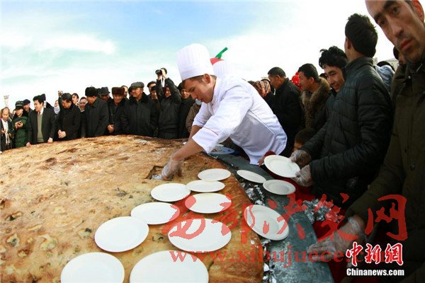 據(jù)悉,庫麥其是維吾爾族傳統(tǒng)美食,又稱且末“大披薩”,用300公斤面粉、200公斤羊肉、60公斤洋蔥,花費(fèi)4個半小時制成,直徑達(dá)3.65米,寓意一年365天,天天有肉馕吃。圖為廚師忙著為游客切“最大的庫麥其”。