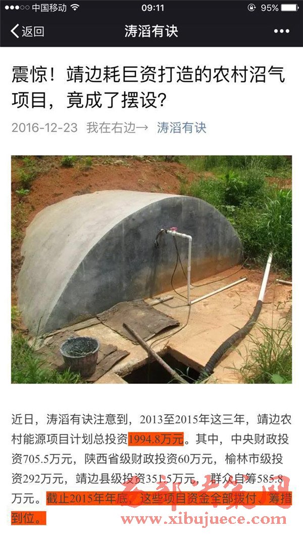 雖然靖邊縣審計(jì)局的審計(jì)報(bào)告,語言高度凝練,也沒給出相應(yīng)的案例和圖片證明,但很顯然,近三年以來,靖邊縣能源辦手持巨額撥款,全力推進(jìn)的農(nóng)村沼氣工程,在今年春天就變成了“利用率低、廢棄率高”的擺設(shè)。如果是這樣的話,投入再多的財(cái)力人力,又有什么意義呢?