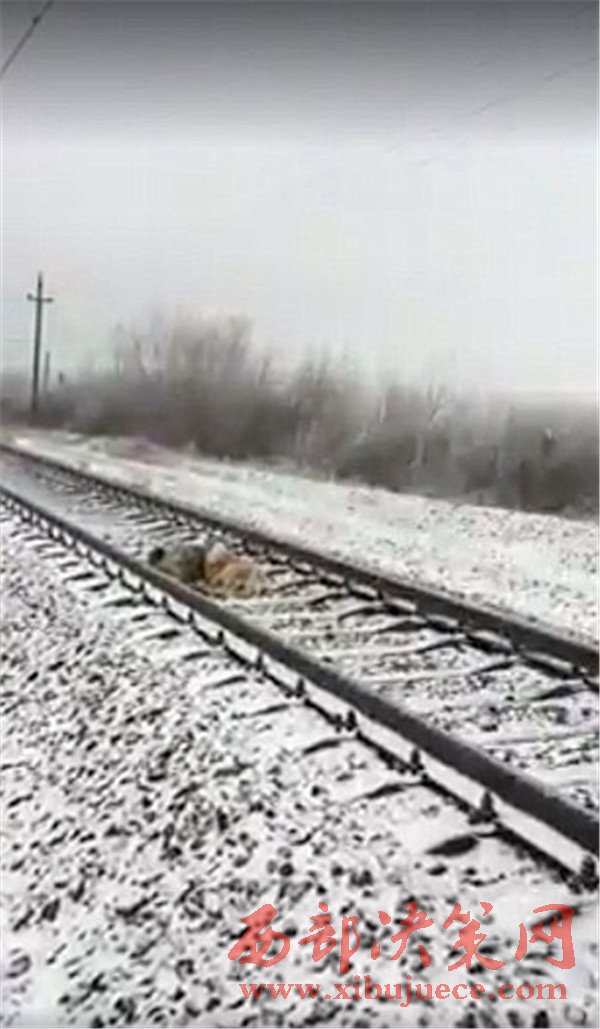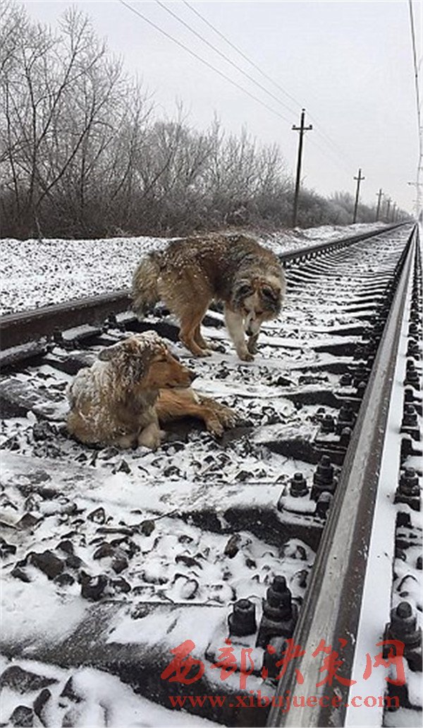 在嚴寒中,兩只狗狗在鐵軌上蜷縮了兩天,一動不動。Lucy受傷嚴重,沒法從鐵軌上挪動下來。Panda一直在她身邊保護她,用自己的身體為她保溫,當有火車逼近時,Panda想盡辦法把Lucy的頭按下,讓火車可以在它們頭頂經(jīng)過。