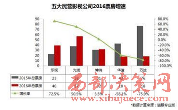 在單個公司增長層面,樂視影業(yè)最為突出,2016年的票房增長率達(dá)到了72.5%;光線影業(yè)2016年的票房增長率達(dá)到35.9%,博納影業(yè)2016年的票房幾乎與去年持平,票房增長率為3.5%;華誼兄弟影業(yè)2016年票房增長率為-58.2%,萬達(dá)影視2016年的票房增長率為-75.9%,票房波動較大。