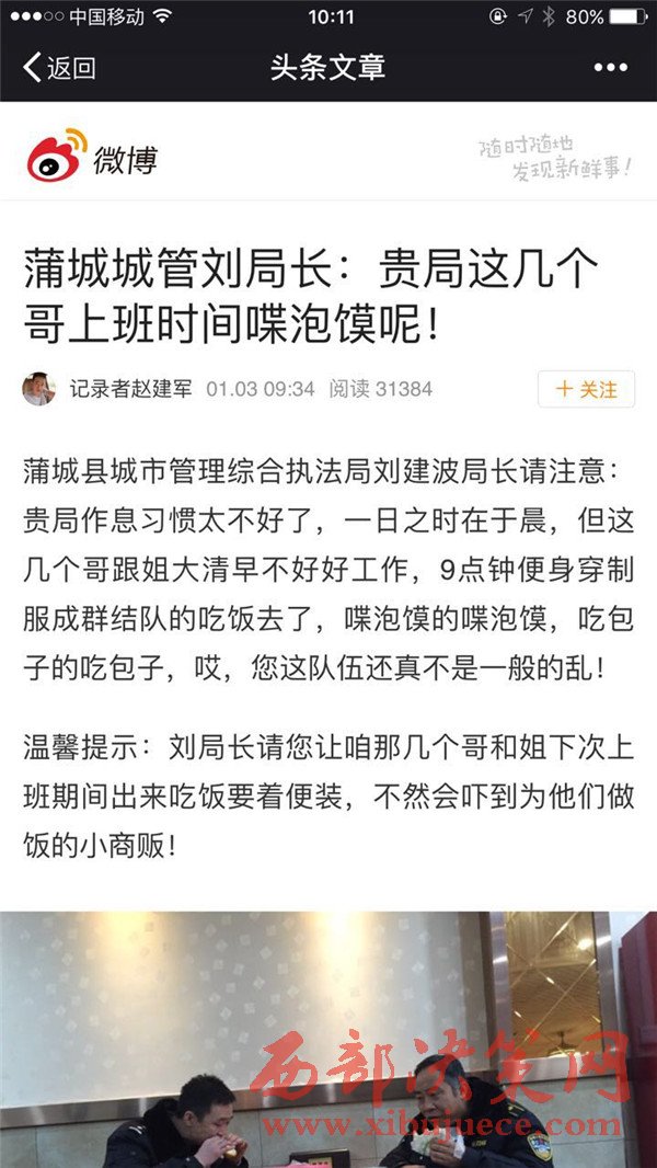 近日,有微博網(wǎng)友爆料:蒲城縣城市管理綜合執(zhí)法局部分工作人員上班著制服外出吃飯。對于這個問題,有網(wǎng)友評論說:“就吃個飯嘛!沒必要小題大做”。還有網(wǎng)友說:“貴局作息習(xí)慣太不好了,一日之時在于晨,但這幾個哥跟姐大清早不好好工作,9點(diǎn)鐘便身穿制服成群結(jié)隊的吃飯去了,咥泡饃的咥泡饃,吃包子的吃包子,哎,這隊伍還真不是一般的亂!”