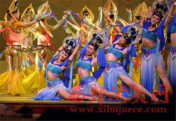 舞劇《大夢敦煌》的整場演出,舞臺布景氣勢宏大,演員服裝精美絕倫,背景音樂古樸典雅,舞蹈編排獨(dú)具匠心。無論是演員的衣著打扮還是群舞,均體現(xiàn)出明顯的中國西部特征。箏、塤、琵琶、簫管等中國傳統(tǒng)樂器加入到管弦樂中,進(jìn)一步烘托出遼闊、雄渾、粗獷、蒼涼的主題音樂。男女主人公的獨(dú)舞與雙人舞或豪放、或纏綿,引人入勝。而敦煌壁畫的輝煌展現(xiàn)與全體演員的謝幕,成了整場演出的高潮。