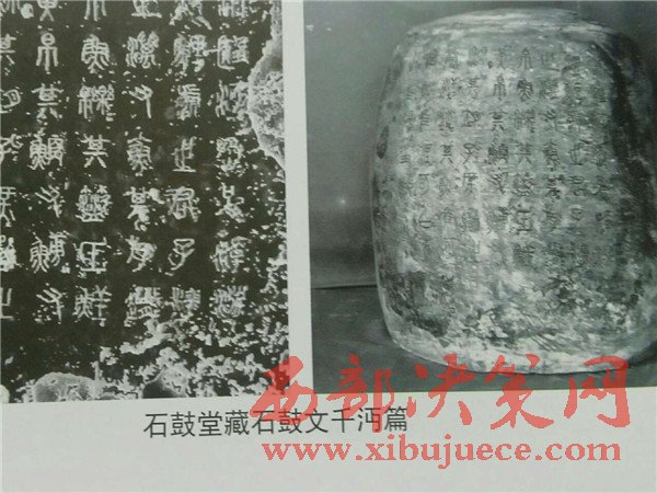 曹老早在40多年前就潛心鉆研石鼓。唐627年,陜西寶雞岐山北坡的荒郊首次發(fā)現(xiàn)石鼓。此地曾是秦朝舊地。共十枚,髙約2尺,徑約3尺,分別刻有大篆四言詩一首,共十首,計(jì)718字。定名:車工、千沔、田車、鑾車、霝雨、乍原、吳人、而師、馬薦、吾水。內(nèi)容最早被認(rèn)為是記敘周宣王出獵的場(chǎng)面,后有專家論證為秦時(shí)記敘游獵的遺物,故稱“獵碣”。