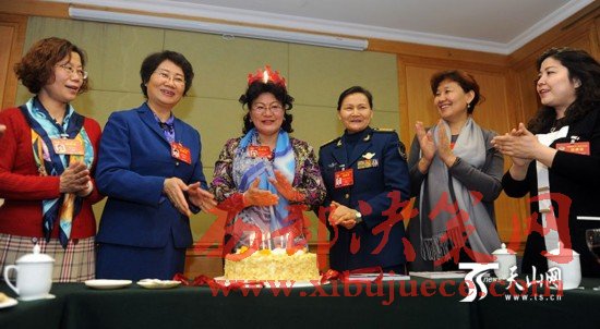 這是一次為6位女委員慶祝節(jié)日的聚會,更是一次民族團(tuán)結(jié)的聯(lián)誼。6位女委員分別來自漢族、維吾爾族、錫伯族、烏孜別克族、柯爾克孜族,姐妹們在一起參加全國兩會已有5年,雖然并不在同一個界別,但大家互幫互學(xué)互助,早已結(jié)下了深厚的友誼。每年“三八”婦女節(jié)都恰逢全國兩會,姐妹們相聚在一起,同慶節(jié)日,親如一家。