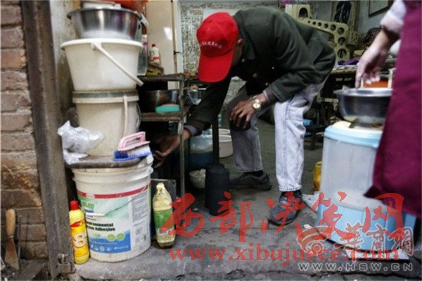 一進(jìn)門,看見61歲的夏平安坐在門房里,端著個(gè)大老碗正在吃面。華商報(bào)記者問:“自己做的面?”他停止吃面,頭一抬,慢慢地說:“老板做的。”他待的是煤場(chǎng)門房,也是他的宿舍,屋子里靠墻擺著一張單人床,上面鋪著厚厚的被褥。院子里堆了好多已經(jīng)打好的煤球。
