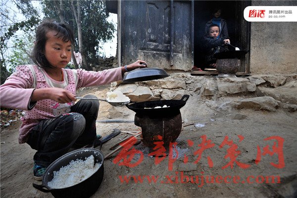 圖為2011年3月31日,在貴州羅甸縣班仁鄉(xiāng),學(xué)生在每學(xué)期開學(xué)的時(shí)候,除了背書包去上學(xué)以外,還要帶著爐灶和鍋碗瓢盆等。包括一年級學(xué)生在內(nèi),在學(xué)校他們每天必須自己生火做飯。