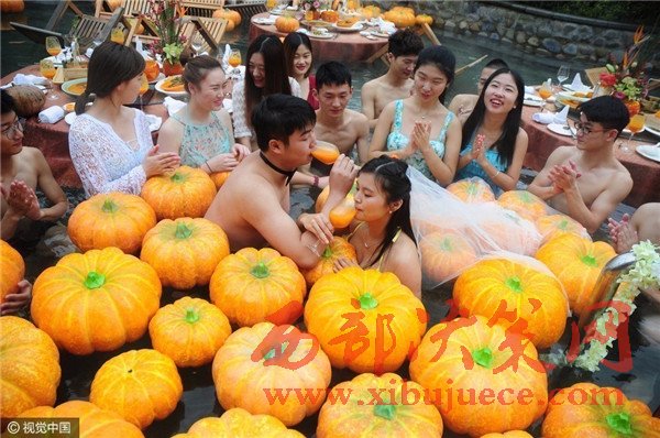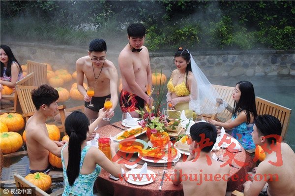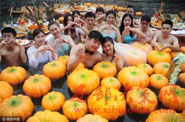 現(xiàn)場(chǎng)賓客都泡在溫泉里,婚宴食材都是用南瓜制成。