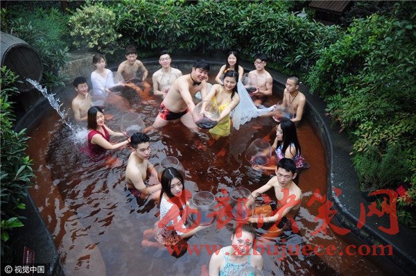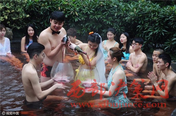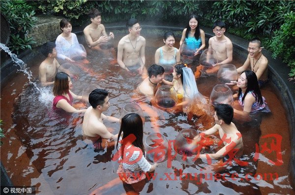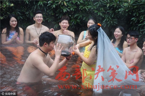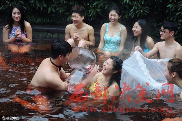 杭州現(xiàn)溫泉南瓜婚禮 新人賓客泳裝參加畫風(fēng)奇特