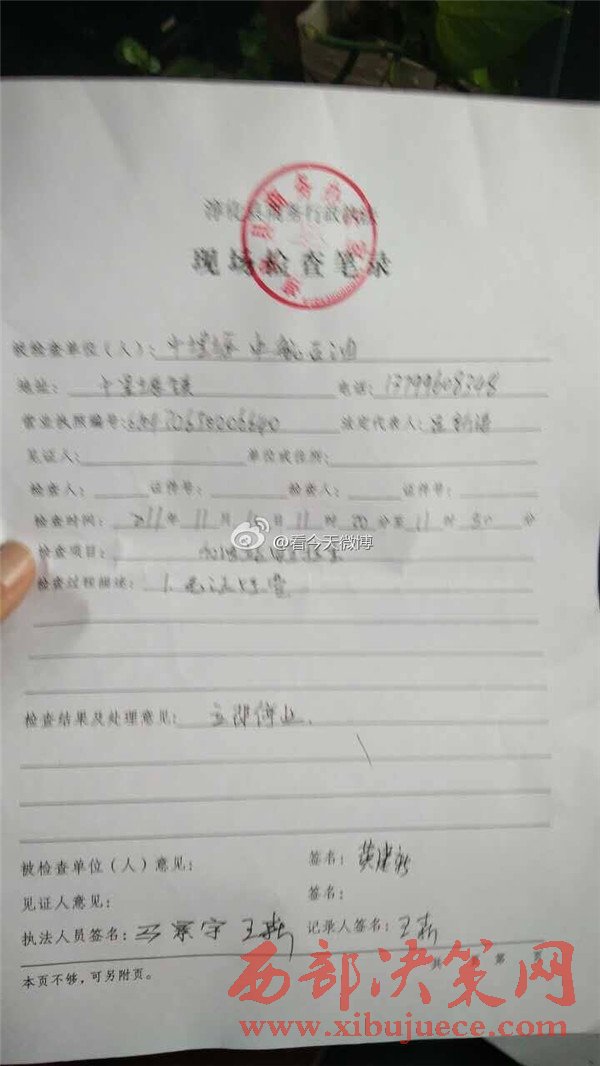 記者到淳化縣安監(jiān)局,采訪了楊副局長,他說:“我們已經(jīng)讓該加油站停業(yè)了,通知他們辦理相關(guān)手續(xù)。”當(dāng)記者提到此加油站還在經(jīng)營時,該局長表示立馬帶人去查處,查完后給我們回復(fù)。隨后記者又來到淳化縣商務(wù)局,說明情況后,辦公室的王姓工作人員說:“我們昨天已經(jīng)查處了,并且下了停業(yè)整改通知書。”記者看到檢查下發(fā)通知書上的日期,確實(shí)是11月15日。
