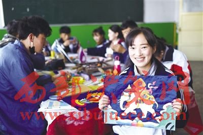3月20日,青海省黃南藏族自治州職業(yè)技術(shù)學校民間傳統(tǒng)工藝系學生關吉展示自己正在制作的一幅堆繡作品。