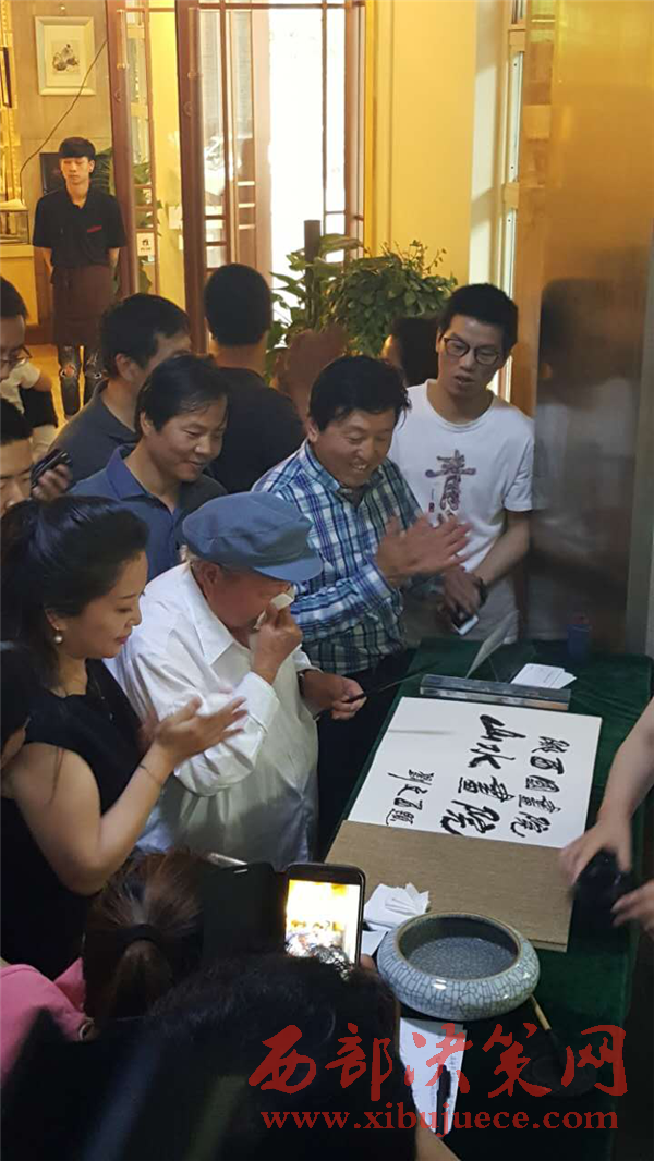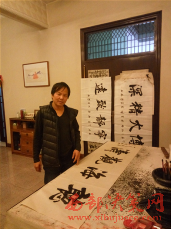 當(dāng)李老師談起書法來,兩眼炯炯有神,自放異彩,書法已融入他的生命。當(dāng)我們走進(jìn)李老師的工作室,練習(xí)的作品如一座小山,筆架上的毛筆各種型號應(yīng)有盡有,裝墨汁的缽盂,很是夸張,不敢說墨池,那樣有點(diǎn)浮夸,有點(diǎn)像關(guān)中人吃面的老碗那樣大的缽盂。沒有上過大學(xué)的他,也許是對傳統(tǒng)文化的摯愛,也許是身邊的朋友影響了他。