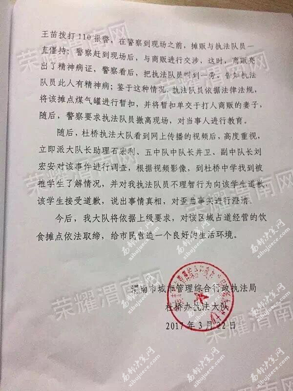 當(dāng)晚6點(diǎn)以后,涉事執(zhí)法隊員所屬執(zhí)法大隊杜橋執(zhí)法大隊書面回復(fù)便在網(wǎng)絡(luò)中被網(wǎng)友們不斷的轉(zhuǎn)載。據(jù)該回復(fù)稱:2017年3月22日中午12時40分左右,杜橋執(zhí)法大隊市容機(jī)動中隊謝鵬、朱勇、康忠民、王苗等4名執(zhí)法隊員在杜橋中學(xué)門前取締占道經(jīng)營飲食攤點(diǎn),當(dāng)時有八個攤點(diǎn)在此經(jīng)營,七個已勸離,其中一戶不愿離開,與執(zhí)法隊員康忠民發(fā)生言語沖突,在康忠民要求其搬離此處,禁止銷售時,攤點(diǎn)經(jīng)營者情緒激動,突然,用鋼管圓凳子砸向執(zhí)法隊員康忠民,致使康忠民胳膊、背部等多處軟組織損傷,執(zhí)法隊員謝鵬、王苗等見狀,立即趕到康忠民處進(jìn)行勸導(dǎo),在勸導(dǎo)過程中,杜橋中學(xué)一名學(xué)生說城管打人,不明真相的約五六十名學(xué)生一起起哄、謾罵城管,因康忠民被打,情緒比較激動,見學(xué)生歪曲事實(shí),上前推了一下起哄的學(xué)生,隨后,機(jī)動中隊執(zhí)法隊員朱勇、陳新亮、魏楠、徐嬌、姜寧寧、孫偉珍趕到現(xiàn)場,準(zhǔn)備對該攤點(diǎn)煤氣罐進(jìn)行暫扣,在執(zhí)法隊員朱勇關(guān)閉液化氣罐閥門時,攤點(diǎn)經(jīng)營者用鋼管圓凳砸向朱勇手臂處,致使朱勇左前臂及手背部多處軟組織損傷,打完人后,打人攤販妻子將凳子抓住,阻止攤販再次打人,這時,攤販用左手抓起攤位上的刀具,威脅城管隊員,并大聲說“這是市長讓他在此擺攤”,這時,旁邊另一名攤販上前奪取打人攤販左手所持的刀具;為了不與攤販再次發(fā)生肢體上的沖突,執(zhí)法隊員王苗撥打110報警,在警察到現(xiàn)場之前,攤販與執(zhí)法隊員一直僵持;警察趕到現(xiàn)場后,與商販進(jìn)行交涉,這時,商販亮出了精神病證,警察看后,把執(zhí)法隊員叫到一旁,告知執(zhí)法隊員此人有精神??;鑒于這種情況,執(zhí)法隊員依據(jù)法律法規(guī),將該攤點(diǎn)煤氣罐進(jìn)行暫扣,并將暫扣單交于打人商販的妻子,隨后,警察要求執(zhí)法隊員撤離現(xiàn)場,對當(dāng)事人進(jìn)行教育。