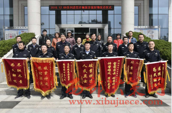 當(dāng)日,陳倉公安分局現(xiàn)場向來自甘肅省會寧縣的受害群眾宋某芳和來自寶雞市千陽縣的受害群眾邢某俠等7名群眾共計(jì)發(fā)放被騙贓款170000余元。當(dāng)宋某芳等7名群眾從該局局長楊會軍和政委苗寶平手中領(lǐng)到被騙的現(xiàn)金時喜極而泣,不時的連聲說“感謝公安局、感謝公安民警、真是謝謝啦”,有的群眾面向公安民警和媒體記者深深鞠躬表達(dá)謝意,并將七面繡著“人民衛(wèi)士、破案神速,為民服務(wù)、匡扶正義”等內(nèi)容的大紅錦旗增送到民警手中,表達(dá)心中的謝意。受害群眾被騙的款數(shù)從數(shù)千元到數(shù)萬元不等,最高達(dá)50000余元。