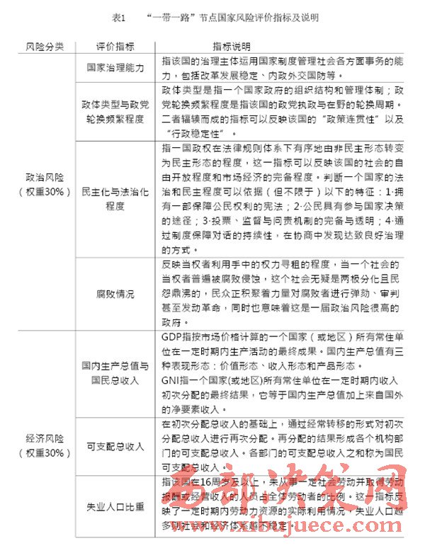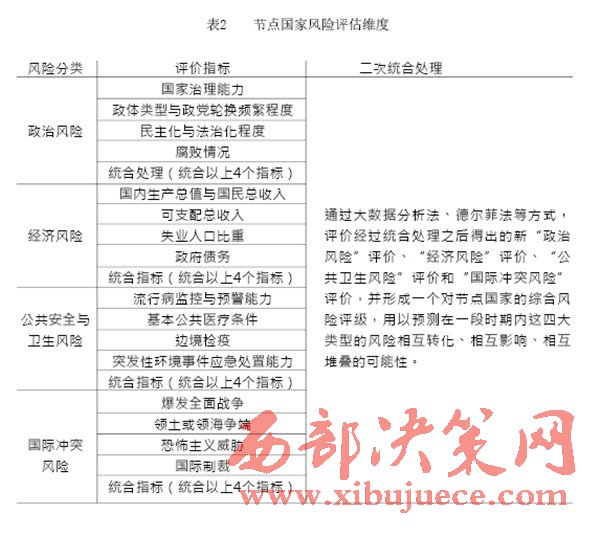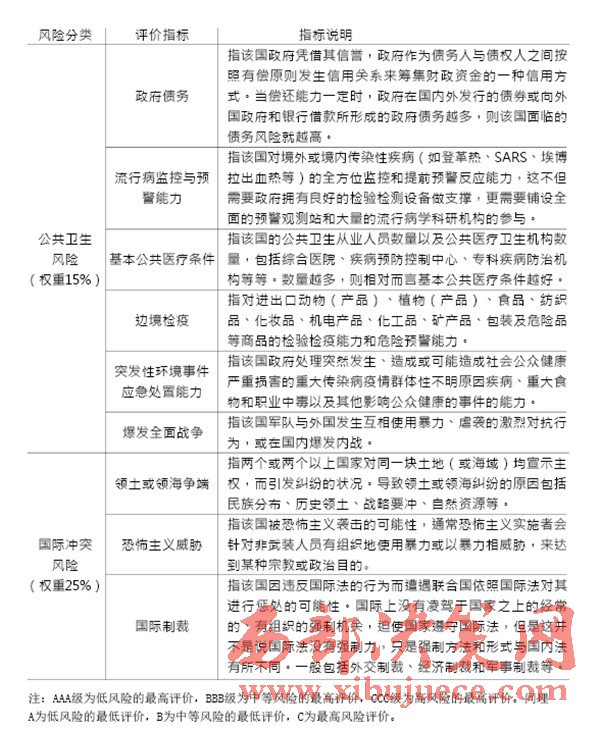 “一帶一路”建設(shè)中重要國家的治理風(fēng)險(xiǎn)是我們的主要關(guān)注對象,在借助國內(nèi)外智庫和科研院所已完成的眾多研究成果的基礎(chǔ)上,建立一套對節(jié)點(diǎn)國家風(fēng)險(xiǎn)的評級體系,如表1(見P28)所示。節(jié)點(diǎn)國家風(fēng)險(xiǎn)評價(jià)指標(biāo)中,政治風(fēng)險(xiǎn)與經(jīng)濟(jì)風(fēng)險(xiǎn)的評價(jià)參考經(jīng)濟(jì)學(xué)人智庫的國家風(fēng)險(xiǎn)模型(EIU country risk model);公共衛(wèi)生風(fēng)險(xiǎn)的評價(jià)參考中國衛(wèi)生與經(jīng)濟(jì)社會發(fā)展統(tǒng)計(jì)數(shù)據(jù)庫對公共衛(wèi)生的指標(biāo)設(shè)計(jì);國際沖突風(fēng)險(xiǎn)評價(jià)根據(jù)經(jīng)濟(jì)學(xué)人智庫發(fā)布的白皮書《愿景與挑戰(zhàn)——“一帶一路”沿線國家風(fēng)險(xiǎn)評估》與中國出口信用保險(xiǎn)公司發(fā)布的2015年版《國家風(fēng)險(xiǎn)分析報(bào)告》和《全球風(fēng)險(xiǎn)地圖》綜合考量得出。具體而言,我們可以從“政治風(fēng)險(xiǎn)”“經(jīng)濟(jì)風(fēng)險(xiǎn)”“公共衛(wèi)生風(fēng)險(xiǎn)”和“國際沖突風(fēng)險(xiǎn)”四個維度來評估選擇出的節(jié)點(diǎn)國家的風(fēng)險(xiǎn),如表2(見P30)所示。