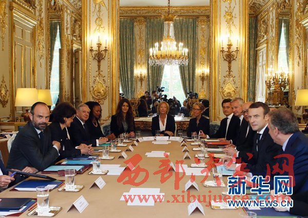 5月18日,在法國巴黎愛麗舍宮,法國總統(tǒng)馬克龍(右二)和總理愛德華·菲利普(左一)出席新一屆政府首次內(nèi)閣會議。