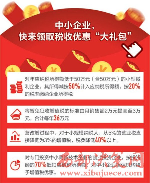 比如,就小微企業(yè)而言,除了將所得稅優(yōu)惠政策提高到50萬元外,我國還將暫免征收增值稅的標(biāo)準(zhǔn)由月銷售額2萬元提高至3萬元,合計(jì)每年36萬元。營改增過程中,年銷售額不超過500萬元的中小企業(yè),可以認(rèn)定為小規(guī)模納稅人,從5%的營業(yè)稅直接降低為3%的增值稅,稅負(fù)降低40%以上。
