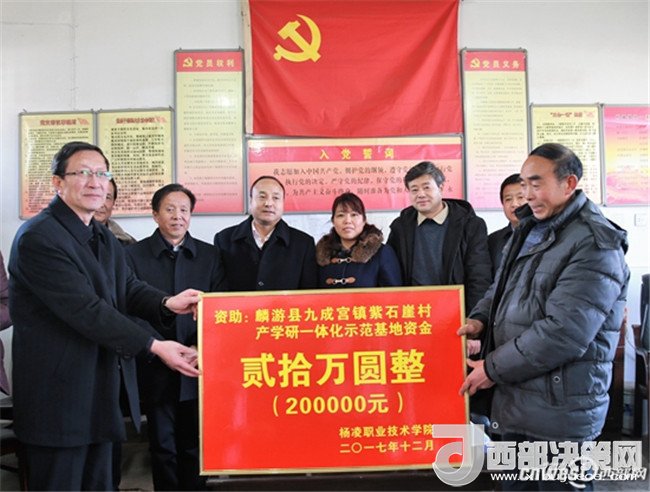 12月15日,為為貫徹落實(shí) 《全省脫貧攻堅(jiān) 2017冬季行動(dòng)方案》精神,扎實(shí)推進(jìn)高校結(jié)對(duì)幫扶“雙百工程”,有效地為當(dāng)?shù)靥厣a(chǎn)業(yè)服務(wù),楊凌職業(yè)技術(shù)學(xué)院黨委書(shū)記趙曼、黨委副書(shū)記任得元一行來(lái)到麟游縣九成宮鎮(zhèn)紫石崖村,為該村捐贈(zèng)20萬(wàn)元,用于建立中蜂養(yǎng)殖產(chǎn)學(xué)研一體化示范基地、核桃豐產(chǎn)栽培產(chǎn)學(xué)研一體化示范基地及電商網(wǎng)絡(luò)平臺(tái)。