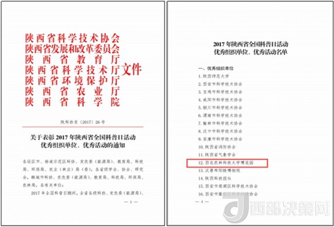 近日,陜西省科協(xié)、省發(fā)改委、省教育廳、省科技廳、省環(huán)保廳、省農(nóng)業(yè)廳和省科學(xué)院聯(lián)合發(fā)布了《關(guān)于表彰2017年陜西省全國科普日活動優(yōu)秀組織單位、優(yōu)秀活動的通知》,西北農(nóng)林科技大學(xué)博覽園獲評2017年全國科普日活動優(yōu)秀組織單位。