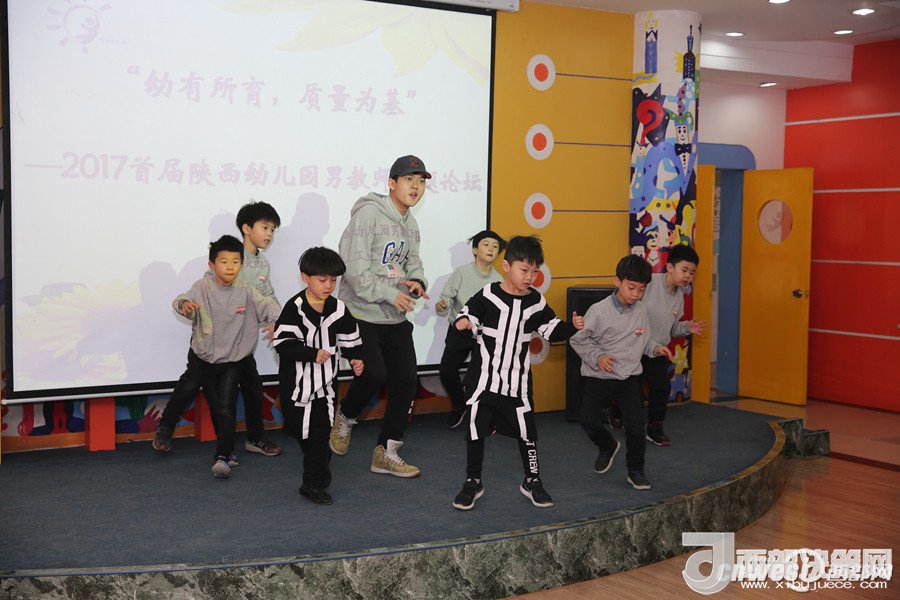 論壇上,西安市浐灞第二幼兒園的謝曉鳴和孩子們帶來的街舞表演點燃了全場,讓大家感受到幼兒園男教師的熱情和激情;陜西師范大學幼兒園的韓凱帶來的鋼琴演奏《一壺美酒》傳達了深切的情感,讓人回味無窮;西航天鼎保育院的趙棟用挺拔健美的身姿表演的拉丁串燒,展現了生命自信的力量;電信十所幼兒園的孫博一只單簧管演奏,吹出了男教師細致柔情的一面;西安市雁塔區(qū)第一幼兒園的陳曉峰演唱的《祖國,慈祥的母親》讓我們領略了幼兒園男教師專業(yè)的唱功和對職業(yè)的自信;西北工業(yè)大學幼兒園教師董樂帶領小朋友展示了動感的啦啦操和籃球活動,場上的小運動員自信的運球、上籃、投球,矯健的身姿,專注的表情,默契的配合,感染著在場的每一位教師;西安市第五保育院肖波和陜西睿星體育一群陽光帥氣的男教師組織的趣味體能游戲將活動氣氛推向了高潮。