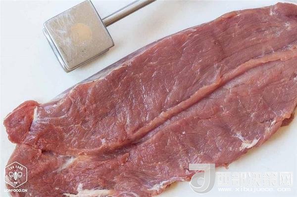 4、將農(nóng)畉豬里脊肉沿邊緣切開,像一本書一樣打開,先用保鮮膜覆蓋,再用木槌或搟面杖輕輕敲打,直到它厚度均勻;