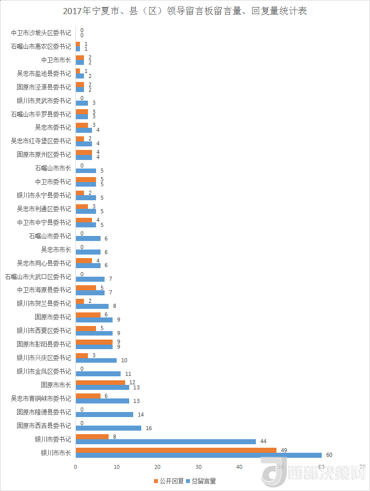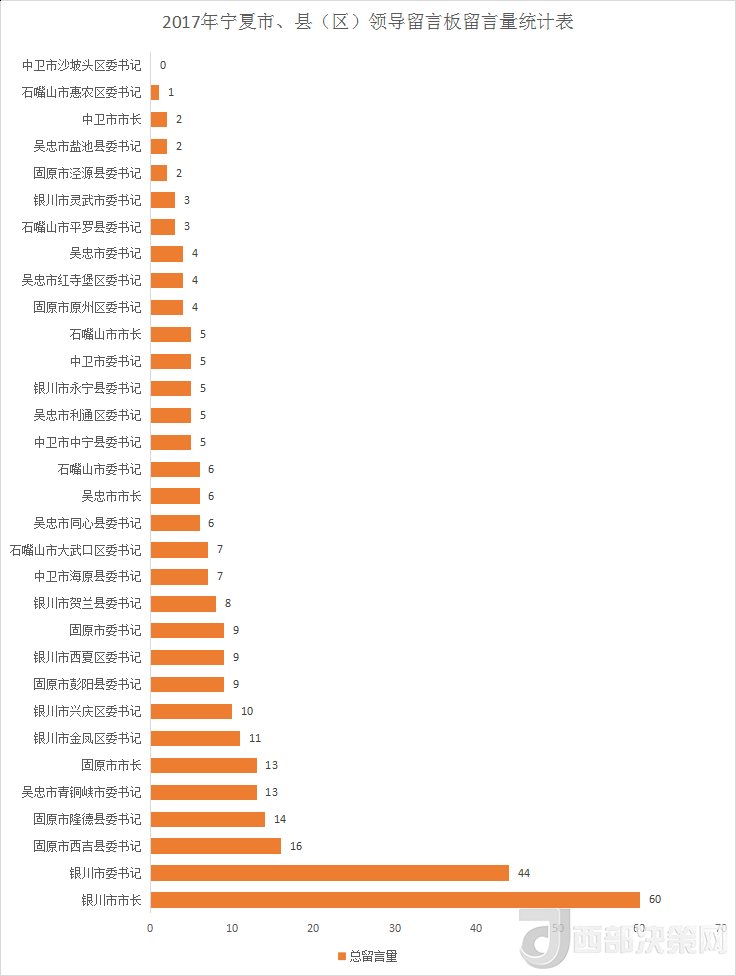 銀川市市長、銀川市委書記、固原市西吉縣委書記的留言量分別以60、44、16條進(jìn)入前三名。盡管網(wǎng)民給固原市西吉縣委書記的留言量進(jìn)前三,但回復(fù)量卻為0。