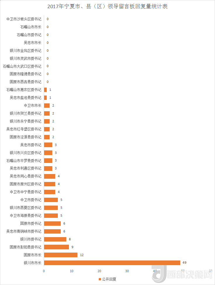 銀川市市長以49條回復(fù)量高居榜首,是第二名固原市市長回復(fù)量的三倍多。