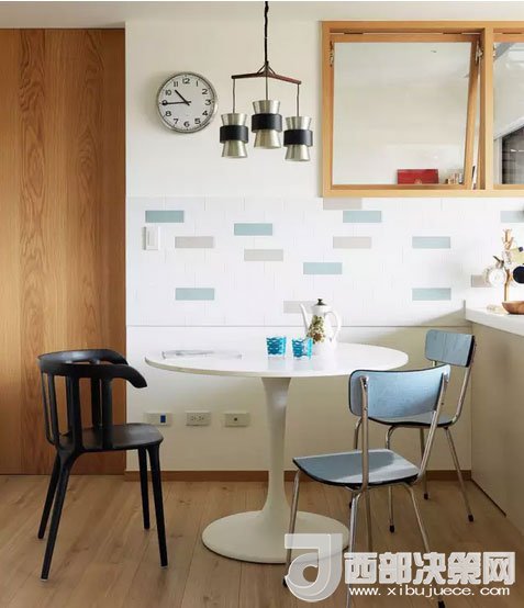 餐區(qū)裝飾十分簡單,一張白色小圓桌,幾把藍色和黑色的餐椅,就成了房主人每天就餐的地方。