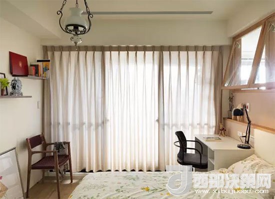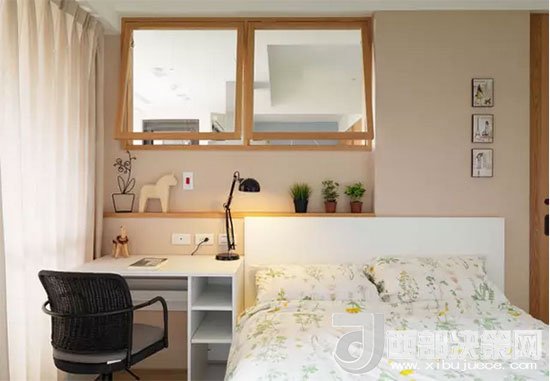 寫字臺緊靠床邊,發(fā)揮了床頭柜的功能,臺燈也可以當做床頭燈,減少不必要的裝飾。房主人利用凹進去的墻面正好做了一個擱物臺,放上幾盆綠植,伴著自己入眠。