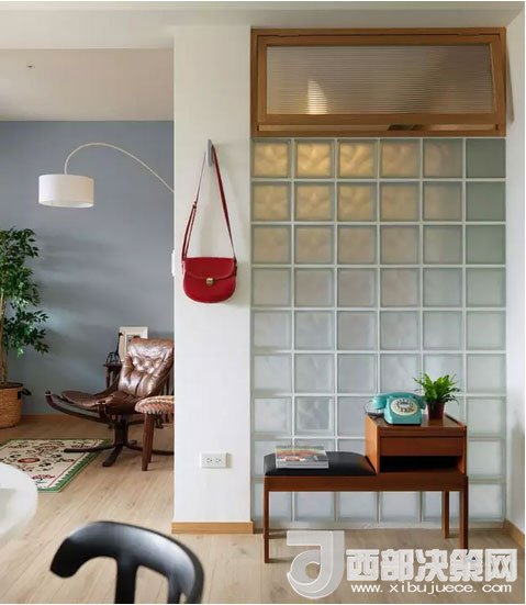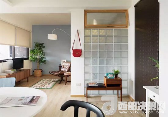 客廳的前方是隔開的陽臺,背面則是衛(wèi)浴室,一處墻面用玻璃磚代替,增加了衛(wèi)浴室的采光,和白色墻面比起來更顯通透。