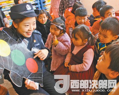 圖為1月15日,派出所民警在下浦幼兒園教小朋友認識“紅綠燈”。