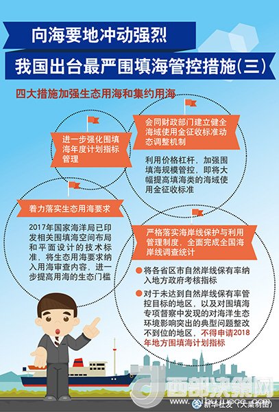 ?。保啡眨瑖液Q缶峙e行圍填海情況新聞發(fā)布會,國家海洋局副局長林山青宣布,結(jié)合圍填海督察整改工作,國家海洋局將采取“史上最嚴圍填海管控措施”,以期保護優(yōu)先、集約利用的用海理念牢固確立,使海域開發(fā)利用得到可持續(xù)發(fā)展。