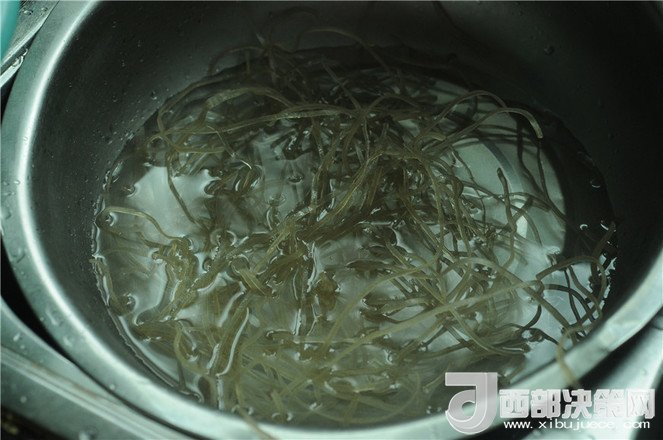 2.紅薯粉放入開水中泡發(fā)十分鐘左右,當紅薯粉絲變軟后撈出來瀝干水