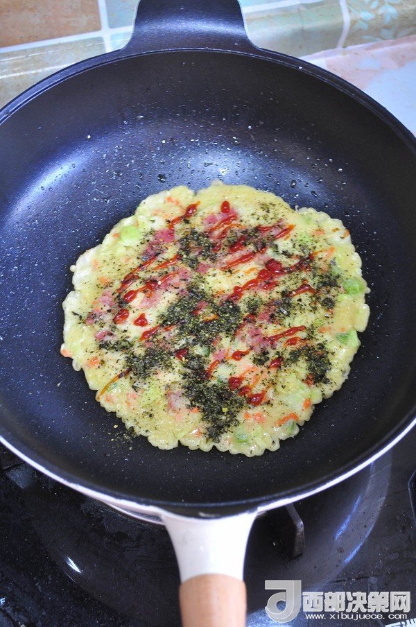 輔料:油 6克 海苔粉 2克 番茄醬 2克 木魚花 2克 沙拉醬 2克 小蔥 1克
