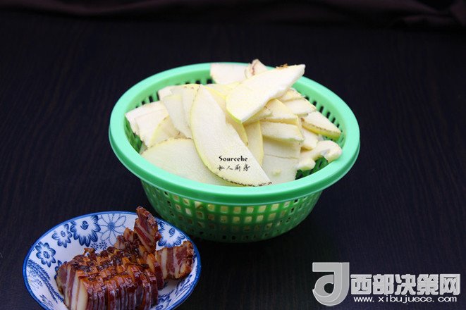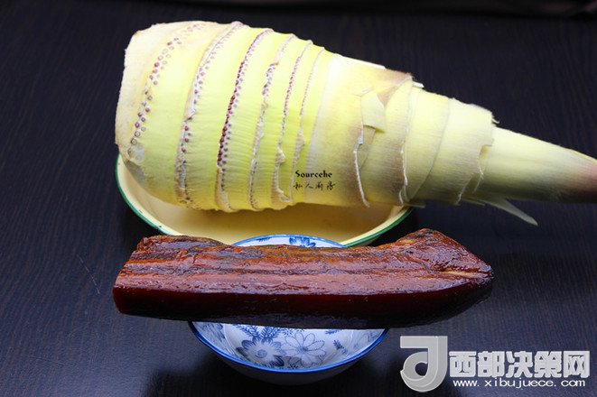 1.新鮮的筍去殼,洗凈,準備臘肉;PS:照片中筍不止500克